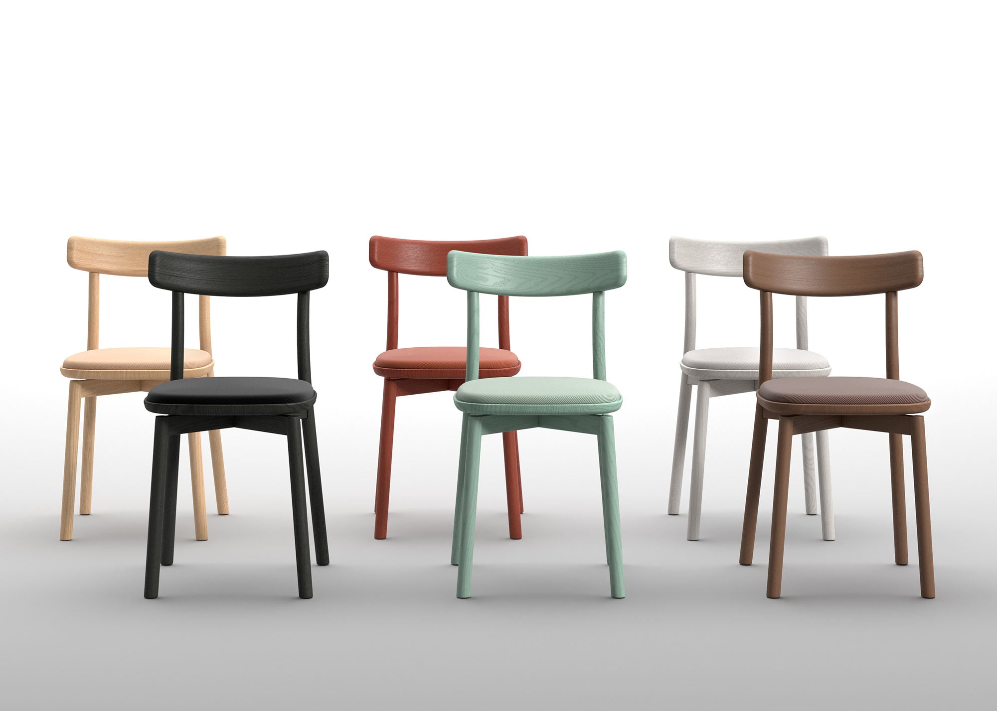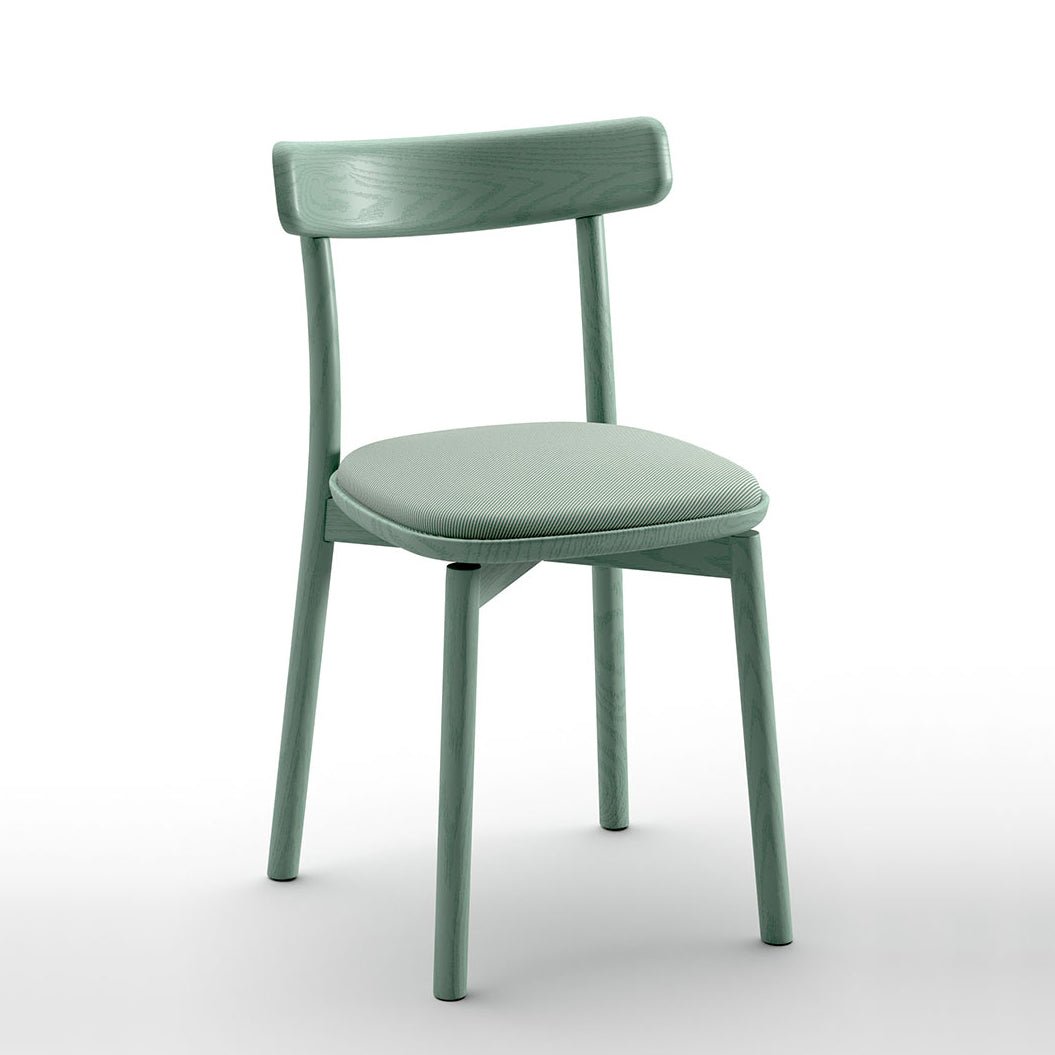 Solid ash chair, painted in wood colors or in ash gray, lichen green and rust open-pore lacquered, with upholstered cushion. The solid wood seat is finely carved and branded with a unique and dedicated graphic. It houses a magnetic upholstered cushion in monochrome combination with the chair structure, removable with a simple hand gesture and washable. Seat and cushion adherence is strong and precise. Chair can not be used without cushion.