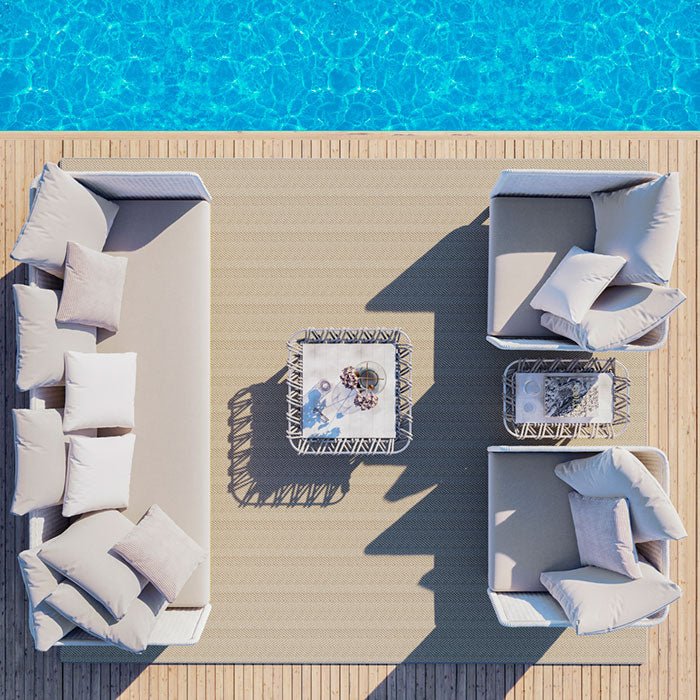 The Mayan civilization dazzled with its art, architecture, mythology, culture ... and left a lasting mark on humanity. We wanted to pay tribute to them by redefining the standards of sisal, manufacturing a sustainable rug made with recycled plastic bottles, much more durable, soft and easy to clean. This collection is suitable for indoors and outdoors. Maya is available in 3 spectacular designs: Wave, Dune, and Gradient. Inspired by the effects of the sand on the beaches of the Riviera Maya, we present Dune design.